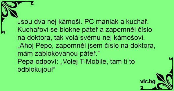 Jsou dva nej kámoši. PC maniak a kuchař. Kuchařovi se blokne páteř a zapomněl číslo na doktora, tak volá svému nej kámošovi. „Ahoj Pepo, zapomněl jsem číslo na doktora, mám zablokovanou páteř.”