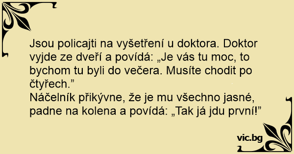 Jsou policajti na vyšetření u doktora. Doktor vyjde ze dveří a povídá: „Je vás tu moc, to bychom tu byli do večera. Musíte chodit po čtyřech.”