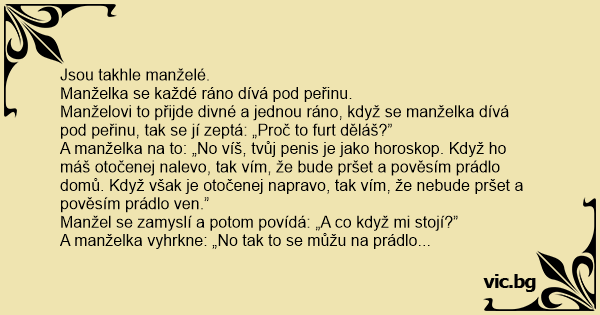Manželovi to přijde divné a jednou ráno, když se manželka dívá pod peřinu, tak se jí zeptá: „Proč to furt děláš?”