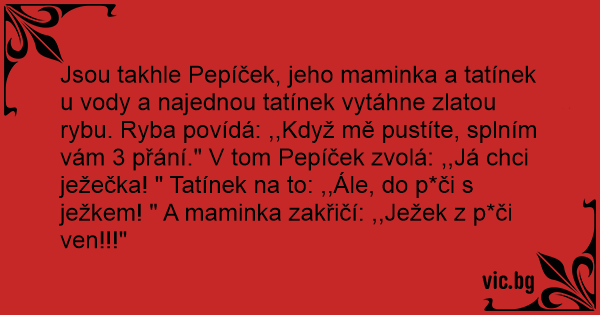 Jsou takhle Pepíček, jeho maminka a tatínek u vody a najednou tatínek vytáhne zlatou rybu. Ryba povídá: ,,Když mě pustíte, splním vám 3 přání." V tom Pepíček zvolá: ,,Já chci ježečka! " Tatínek na to: ,,Ále, do p*či s ježkem! " A maminka zakřičí: ,,Ježek z p*či ven!!!"