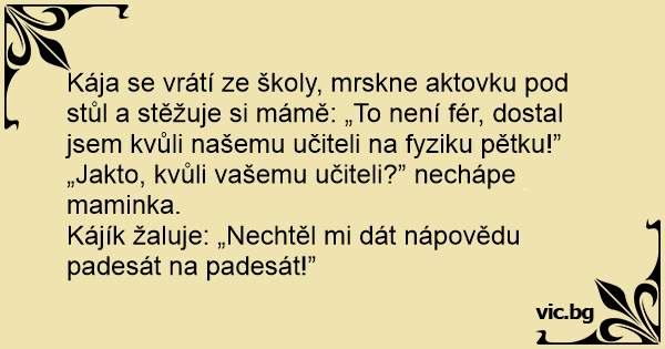 Kája se vrátí ze školy, mrskne aktovku pod stůl a stěžuje si mámě: „To není fér, dostal jsem kvůli našemu učiteli na fyziku pětku!”