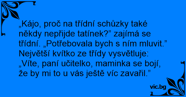„Kájo, proč na třídní schůzky také někdy nepřijde tatínek?” zajímá se třídní. „Potřebovala bych s ním mluvit.”