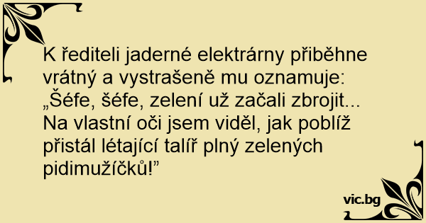 K řediteli jaderné elektrárny přiběhne vrátný a vystrašeně mu oznamuje: „Šéfe, šéfe, zelení už začali zbrojit... Na vlastní oči jsem viděl, jak poblíž přistál létající talíř plný zelených pidimužíčků!”