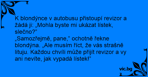„Samozřejmě, pane,” ochotně řekne blondýna. „Ale musím říct, že vás strašně lituju. Každou chvíli může přijít revizor a vy ani nevíte, jak vypadá lístek!”