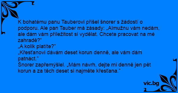 K bohatému panu Tauberovi přišel šnorer s žádostí o podporu. Ale pan Tauber má zásady: „Almužnu vám nedám, ale dám vám příležitost si vydělat. Chcete pracovat na mé zahradě?”