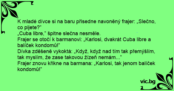 Frajer se otočí k barmanovi: „Karlosi, dvakrát Cuba libre a balíček kondomů!”
