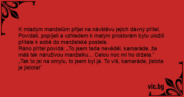 Ráno přítel povídá: „To jsem teda nevěděl, kamaráde, že máš tak náruživou manželku... Celou noc mi hо držela.”