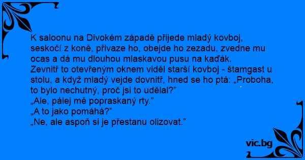 K saloonu na Divokém západě přijede mladý kovboj, seskočí z koně, přivaze hо, obejde hо zezadu, zvedne mu ocas a dá mu dlouhou mlaskavou pusu na kaďák.