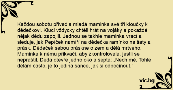 Každou sobotu přivedla mladá maminka své tři kloučky k dědečkovi. Kluci vždycky chtěli hrát na vojáky a pokaždé nějak dědu zapojili. Jednou se takhle maminka vrací a sleduje, jak Pepíček namíří na dědečka ramínko na šaty a prásk. Dědeček sebou práskne o zem a dělá mrtvého. Maminka k němu přikvačí, aby zkontrolovala, jestli se nepraštil. Děda otevře jedno oko a šeptá: „Nech mě. Tohle dělám často, je to jediná šance, jak si odpočinout.”