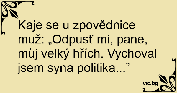 Kaje se u zpovědnice muž: „Odpusť mi, pane, můj velký hřích. Vychoval jsem syna politika...”