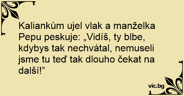 Kaliankům ujel vlak a manželka Pepu peskuje: „Vidíš, ty blbe, kdybys tak nechvátal, nemuseli jsme tu teď tak dlouho čekat na další!”