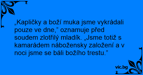 „Kapličky a boží muka jsme vykrádali pouze ve dne,” oznamuje před soudem zlotřilý mladík. „Jsme totiž s kamarádem nábožensky založení a v noci jsme se báli božího trestu.”