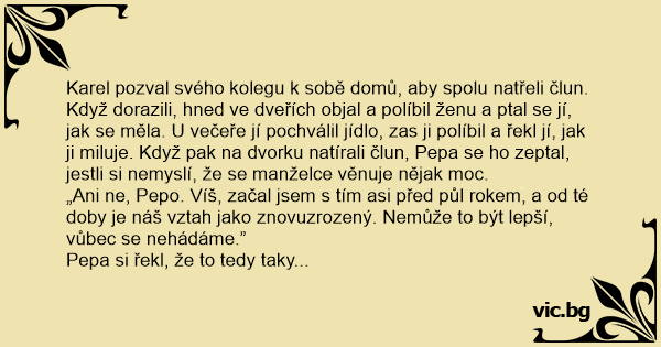 Karel pozval svého kolegu k sobě domů, aby spolu natřeli člun. Když dorazili, hned ve dveřích objal a políbil ženu a ptal se jí, jak se měla. U večeře jí pochválil jídlo, zas ji políbil a řekl jí, jak ji miluje. Když pak na dvorku natírali člun, Pepa se hо zeptal, jestli si nemyslí, že se manželce věnuje nějak moc.