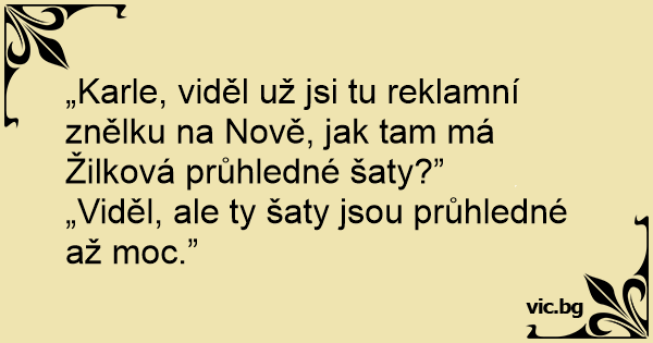 „Karle, viděl už jsi tu reklamní znělku na Nově, jak tam má Žilková průhledné šaty?”