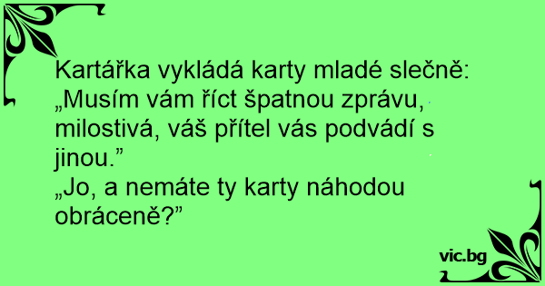 Kartářka vykládá karty mladé slečně: „Musím vám říct špatnou zprávu, milostivá, váš přítel vás podvádí s jinou.”