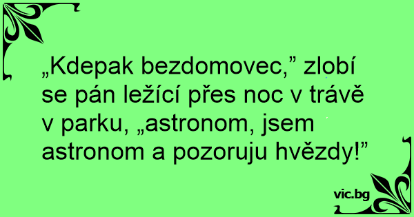 „Kdepak bezdomovec,” zlobí se pán ležící přes noc v trávě v parku, „astronom, jsem astronom a pozoruju hvězdy!”