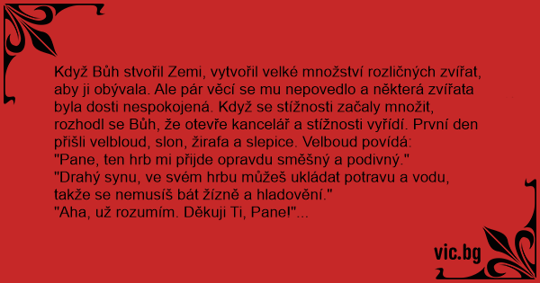 Když Bůh stvořil Zemi, vytvořil velké množství rozličných zvířat, aby ji obývala. Ale pár věcí se mu nepovedlo a některá zvířata byla dosti nespokojená. Když se stížnosti začaly množit, rozhodl se Bůh, že otevře kancelář a stížnosti vyřídí. První den přišli velbloud, slon, žirafa a slepice. Velboud povídá: