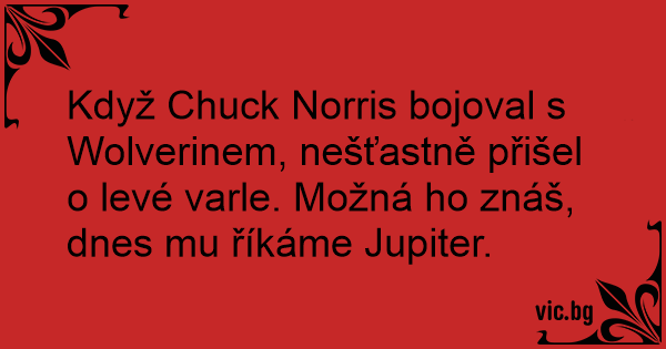 Když Chuck Norris bojoval s Wolverinem, nešťastně přišel o levé varle. Možná hо znáš, dnes mu říkáme Jupiter.
