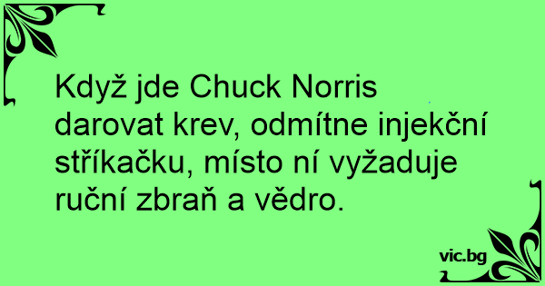 Když jde Chuck Norris darovat krev, odmítne injekční stříkačku, místo ní vyžaduje ruční zbraň a vědro.