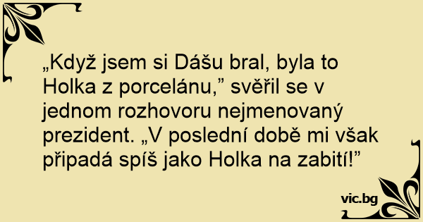„Když jsem si Dášu bral, byla to Holka z porcelánu,” svěřil se v jednom rozhovoru nejmenovaný prezident. „V poslední době mi však připadá spíš jako Holka na zabití!”
