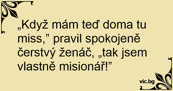 „Když mám teď doma tu miss,” pravil spokojeně čerstvý ženáč, „tak jsem vlastně misionář!”