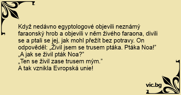 Když nedávno egyptologové objevili neznámý faraonský hrob a objevili v něm živého faraona, divili se a ptali se jej, jak mohl přežít bez potravy. On odpověděl: „Živil jsem se trusem ptáka. Ptáka Noa!”