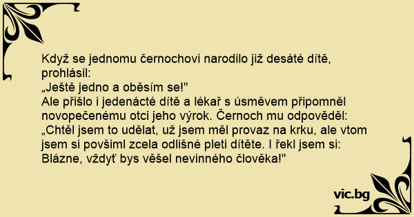 Ale přišlo i jedenácté dítě a lékař s úsměvem připomněl novopečenému otci jeho výrok. Černoch mu odpověděl: