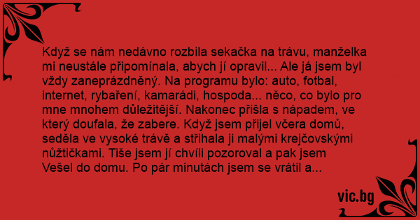 Když se nám nedávno rozbila sekačka na trávu, manželka mi neustále připomínala, abych jí opravil... Ale já jsem byl vždy zaneprázdněný. Na programu bylo: auto, fotbal, internet, rybaření, kamarádi, hospoda... něco, co bylo pro mne mnohem důležitější. Nakonec přišla s nápadem, ve který doufala, že zabere. Když jsem přijel včera domů, seděla ve vysoké trávě a střihala ji malými krejčovskými nůžtičkami. Tiše jsem jí chvíli pozoroval a pak jsem