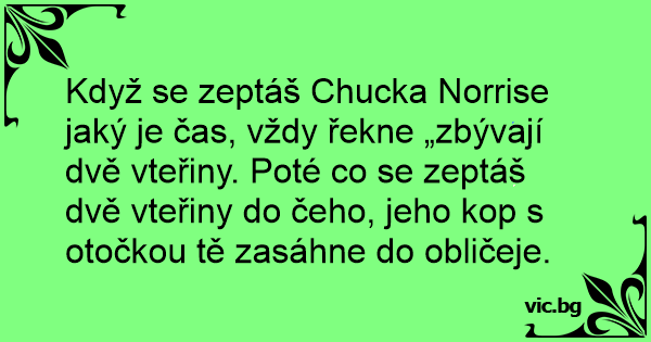 Když se zeptáš Chucka Norrise jaký je čas, vždy řekne „zbývají dvě vteřiny. Poté co se zeptáš dvě vteřiny do čeho, jeho кор s otočkou tě zasáhne do obličeje.