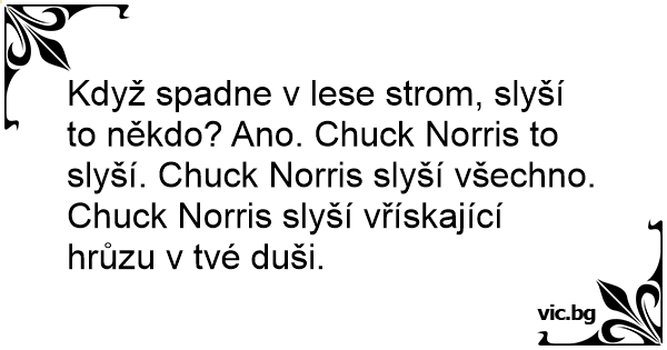 Když spadne v lese strom, slyší to někdo? Ano. Chuck Norris to slyší. Chuck Norris slyší všechno. Chuck Norris slyší vřískající hrůzu v tvé duši.