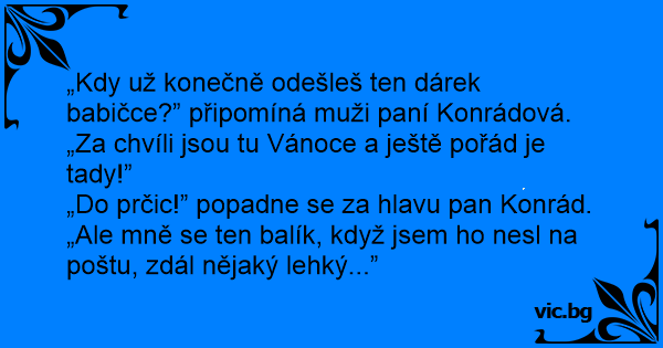 „Kdy už konečně odešleš ten dárek babičce?” připomíná muži paní Konrádová. „Za chvíli jsou tu Vánoce a ještě pořád je tady!”