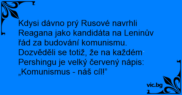 Kdysi dávno prý Rusové navrhli Reagana jako kandidáta na Leninův řád za budování komunismu. Dozvěděli se totiž, že na každém Pershingu je velký červený nápis: „Komunismus - náš cíl!”