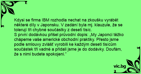 Kdysi se firma IBM rozhodla nechat na zkoušku vyrábět některé díly v Japonsku. V zadání byla mj. klauzule, že se tolerují tři chybné součástky z deseti tisíc.