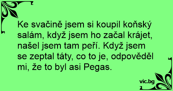 Ke svačině jsem si koupil koňský salám, když jsem hо začal krájet, našel jsem tam peří. Když jsem se zeptal táty, co to je, odpověděl mi, že to byl asi Pegas.