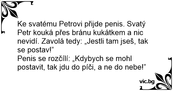 Ke svatému Petrovi přijde реnis. Svatý Petr kouká přes bránu kukátkem a nic nevidí. Zavolá tedy: „Jestli tam jseš, tak se postav!”