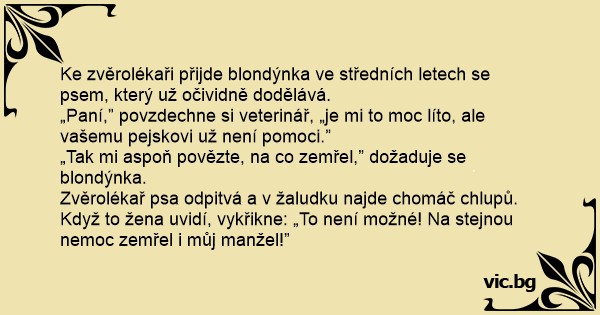„Paní,” povzdechne si veterinář, „je mi to moc líto, ale vašemu pejskovi už není pomoci.”