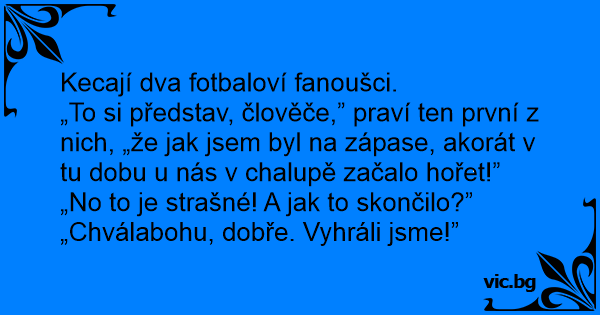 „To si představ, člověče,” praví ten první z nich, „že jak jsem byl na zápase, akorát v tu dobu u nás v chalupě začalo hořet!”