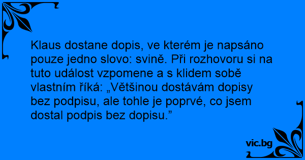 Klaus dostane dopis, ve kterém je napsáno pouze jedno slovo: svině. Při rozhovoru si na tuto událost vzpomene a s klidem sobě vlastním říká: „Většinou dostávám dopisy bez podpisu, ale tohle je poprvé, co jsem dostal podpis bez dopisu.”