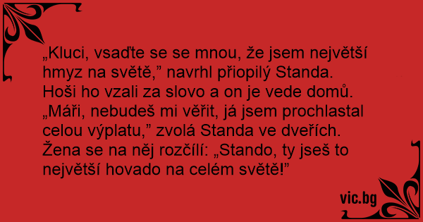 „Kluci, vsaďte se se mnou, že jsem největší hmyz na světě,” navrhl přiopilý Standa.