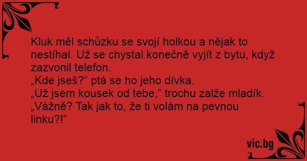 Kluk měl schůzku se svojí holkou a nějak to nestíhal. Už se chystal konečně vyjít z bytu, když zazvonil telefon.