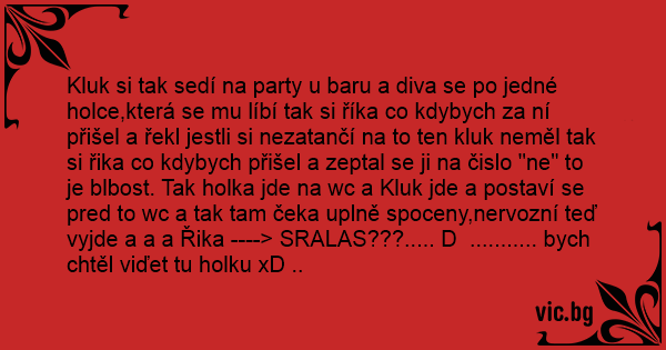 Kluk si tak sedí na party u baru a diva se po jedné holce,která se mu líbí tak si říka co kdybych za ní přišel a řekl jestli si nezatančí na to ten kluk neměl tak si řika co kdybych přišel a zeptal se ji na čislo "ne" to je blbost. Tak holka jde na wc a Kluk jde a postaví se pred to wc a tak tam čeka uplně spoceny,nervozní teď vyjde a a a Řika ----> SRALAS???..... D ........... bych chtěl viďet tu holku xD ..