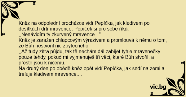 Kněz na odpolední procházce vidí Pepíčka, jak kladivem po desítkách drtí mravence. Pepíček si pro sebe říká: