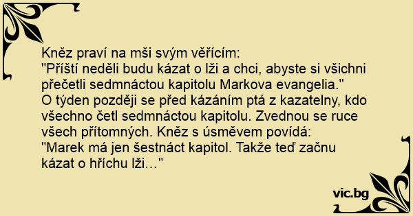 Liar Sermon Το ευαγγέλιο Завършва църковната служба, свещеникът обявява: A minister told his congregation, "Next week I plan to preach about the sin of lying. To help you understand my sermon, I want you all to read Mark 17." Un dimanche, à la messe, le curé dit: - La semaine prochaine, je ferai mon sermon sur le mensonge. Pour en savoir plus sur ce pêché, je vous invite à lire l'évangile selon St Marc, chapitre 17. Le dimanche suivant, alors qu'il s'apprête à monter en chaire pour le prêche, le curé pose la question:... Pastori lopetti saarnansa kertoen seuraavan sunnuntain saarnassaan käsittelevänsä valheen syntiä. Sitä varten hän kehotti kaikkia lukemaan ennalta Markuksen evankeliumin 17. luvun. Seuraavana... A prédikátor a mise végén így szól a gyülekezethez: - Jövő héten a hazugságról lesz szó. Addig olvassátok el Márk könyvének 17-ik fejezetét! Következő héten így szól a hívekhez: - Emelje fel a... Sveštenik je završio dugačku nedeljnu misu rečima: - "Sledeće nedelje, glavna tema moje besede biće greh laganja. Da biste lakše shvatili moju narednu besedu, želim da svi do naredne nedelje...