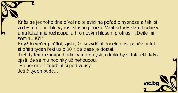 Kněz se jednoho dne díval na televizi na pořad o hypnóze a řekl si, že by mu to mohlo vynést slušné peníze. Vzal si tedy zlaté hodinky a na kázání je rozhoupal a hromovým hlasem prohlásil: „Dejte mi sem 10 Kč!”
