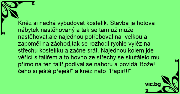 Kněz si nechá vybudovat kostelík. Stavba je hotova nábytek nastěhovaný a tak se tam už může nastěhovat,ale najednou potřeboval na velkou a zapoměl na záchod,tak se rozhodl rychle vyléz na střechu kostelíku a začne srát. Najednou kolem jde věřící s talířem a to hovno ze střechy se skutálelo mu přímo na ten talíř,podíval se nahoru a povídá"Bože! čeho si ještě přeješ!" a kněz nato "Papír!!!"