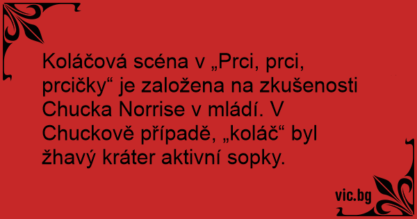 Koláčová scéna v „Prci, prci, prcičky“ je založena na zkušenosti Chucka Norrise v mládí. V Chuckově případě, „koláč“ byl žhavý kráter aktivní sopky.