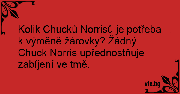 Kolik Chucků Norrisů je potřeba k výměně žárovky? Žádný. Chuck Norris upřednostňuje zabíjení ve tmě.