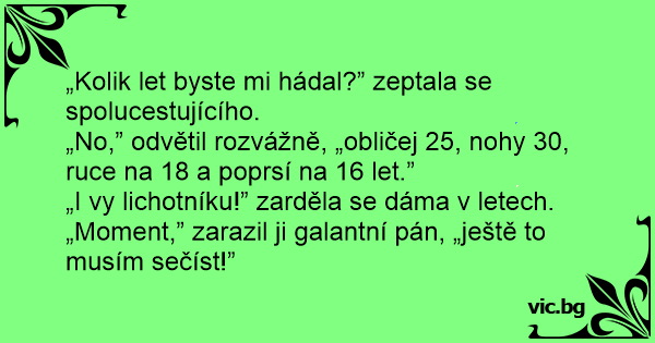 „No,” odvětil rozvážně, „obličej 25, nohy 30, ruce na 18 a poprsí na 16 let.”