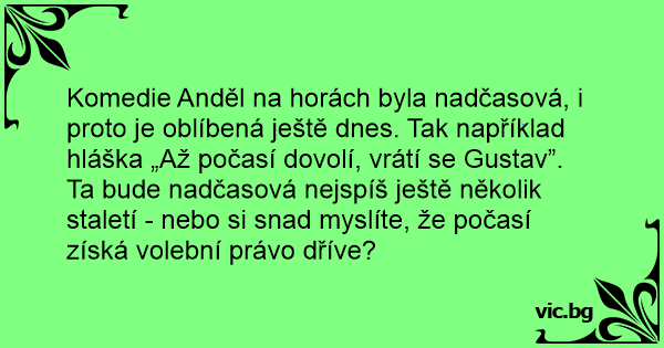 Komedie Anděl na horách byla nadčasová, i proto je oblíbená ještě dnes. Tak například hláška „Až počasí dovolí, vrátí se Gustav”. Ta bude nadčasová nejspíš ještě několik staletí - nebo si snad myslíte, že počasí získá volební právo dříve?