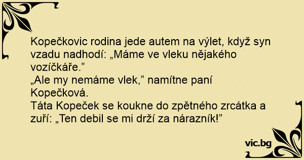 Táta Kopeček se koukne do zpětného zrcátka a zuří: „Ten debil se mi drží za nárazník!”